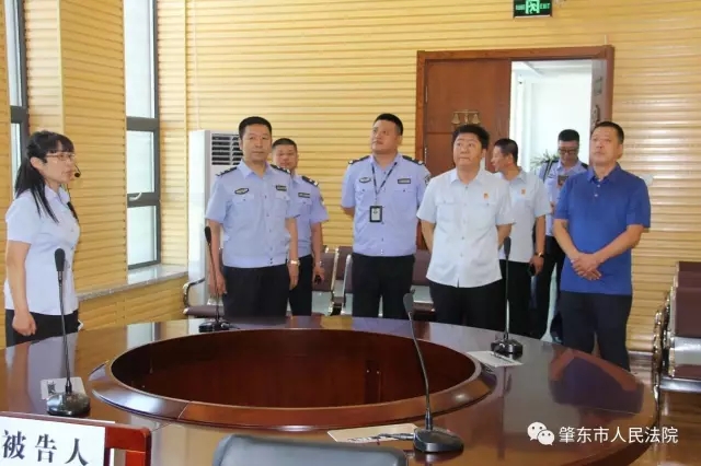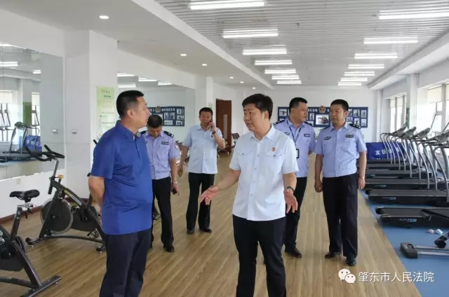 邢海东同志一行先后参观了信息集中控制中心、诉讼服务中心、法警大队装备库、法警大队党建活动室、审判法庭、法警体能训练中心等。